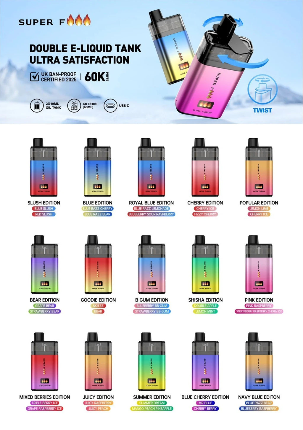 Super Fire Ultra 60K Vape Pod Kit – 4in1 | 20mg Nicotine | Rechargeable E-Cig | TPD Compliant UK 🔥